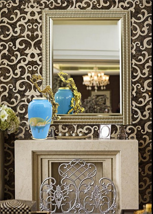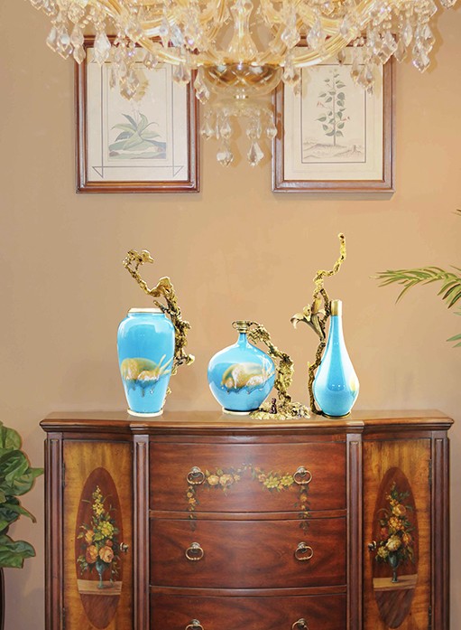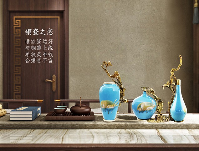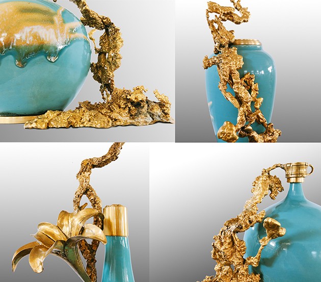 首先給彩瓷加了一個(gè)銅底座、銅沿口,然后把熔化后的銅水倒進(jìn)沙里,形成不同自然形狀后再與彩瓷底座和沿口相連,效果出人意料的好,厚重與輕脆相融,古樸與現(xiàn)代結(jié)合,也不知是瓷攀上了銅,還是銅纏上了瓷。相得益彰,妙不可言。